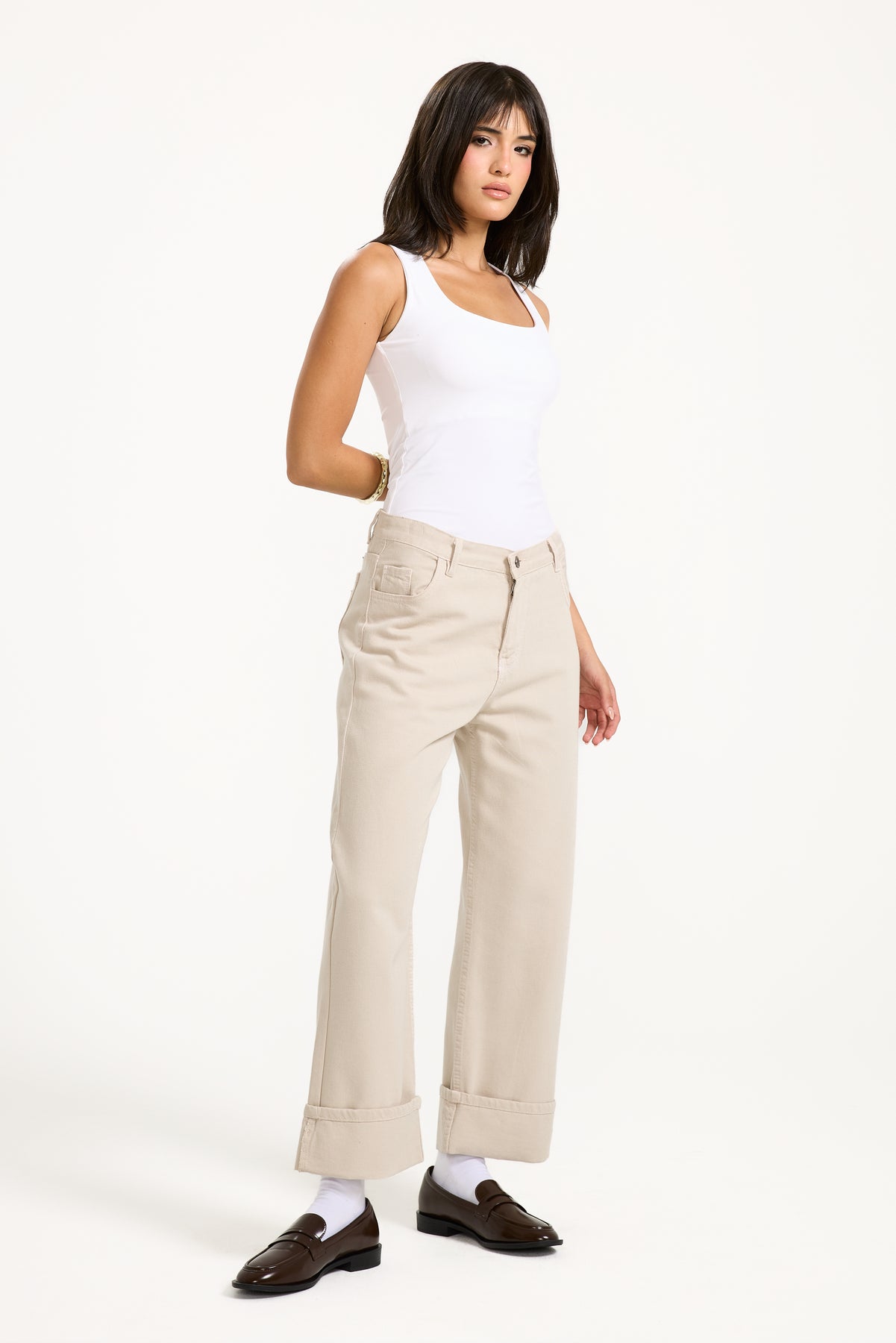 These pants are beige, folded at the bottom and our logo at the back pocket
