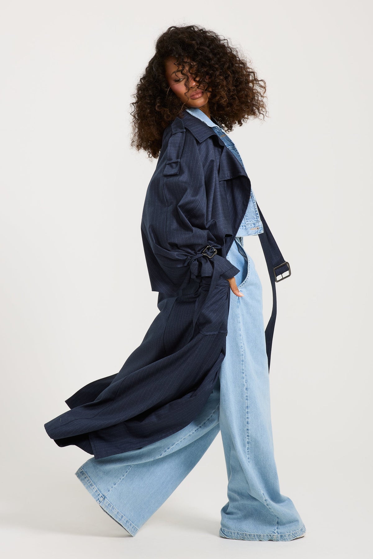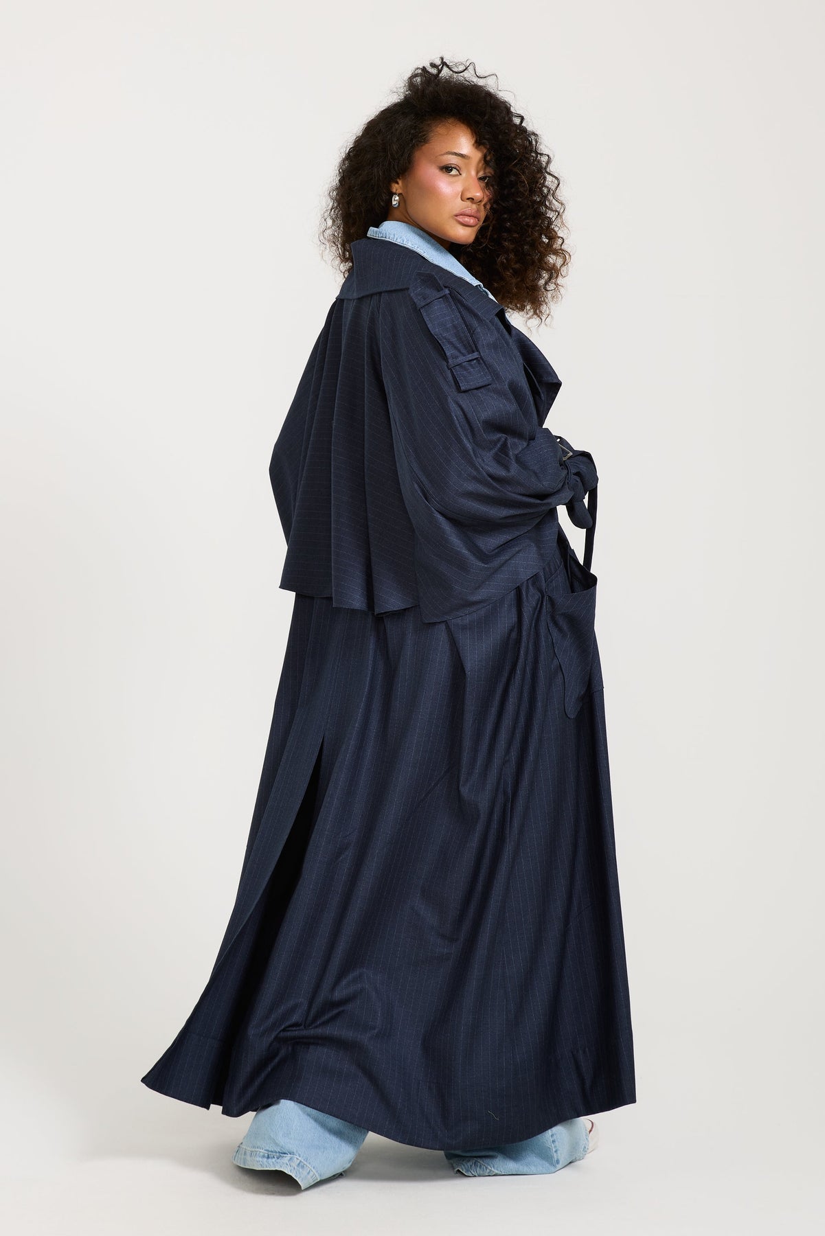 This trench coat is navy with stripes, with buttons all the way down and can be cinched at the wrist, perfect for everyday and can be dressed up or down accordingly