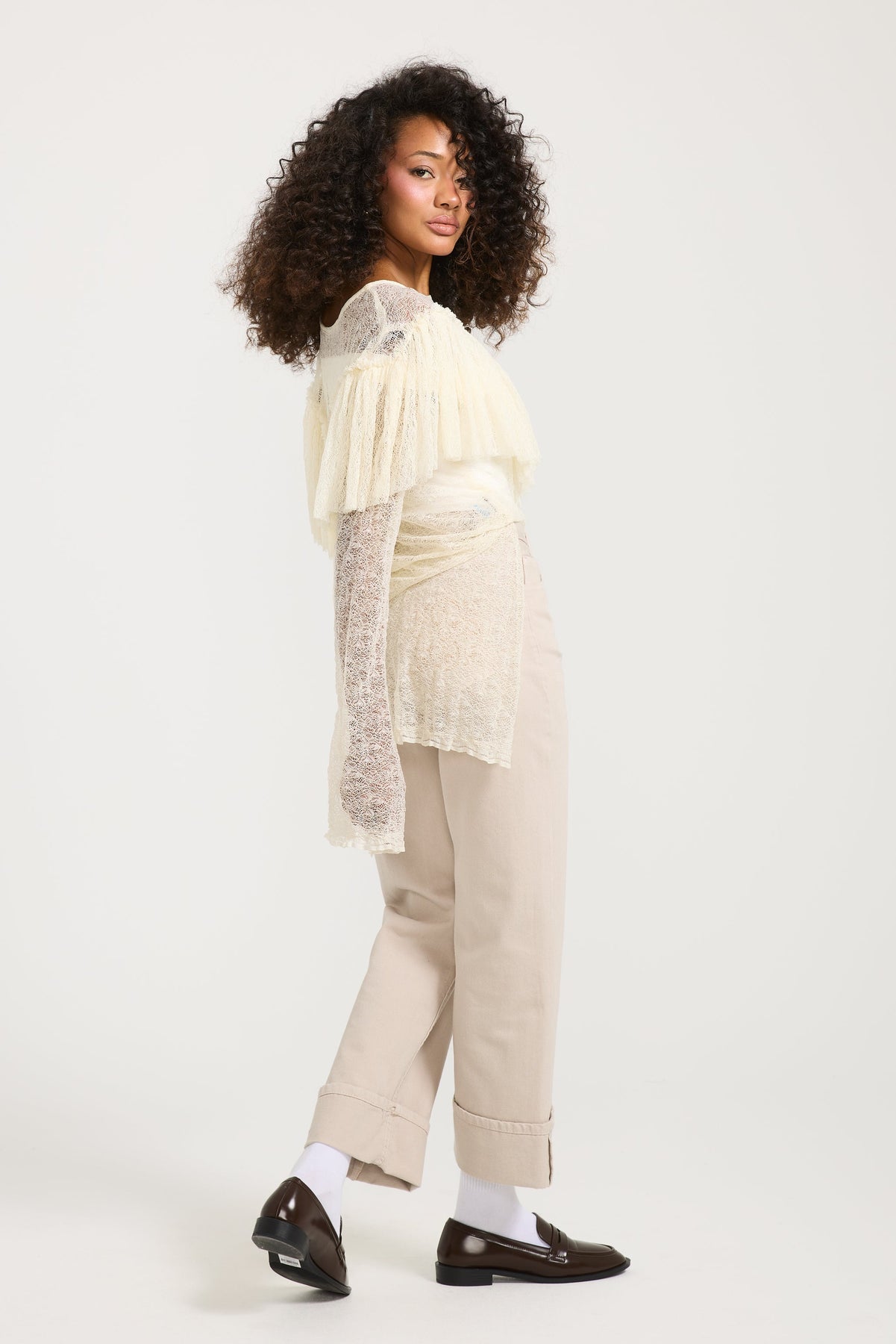 This stunning top exudes elegance with the delicate lace. The V ruffle featured in the middle further adds on to the look