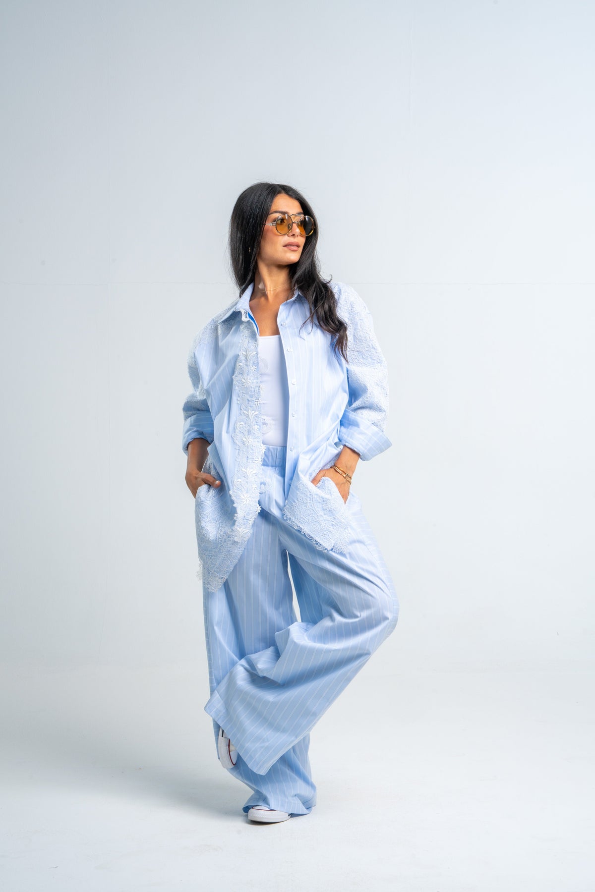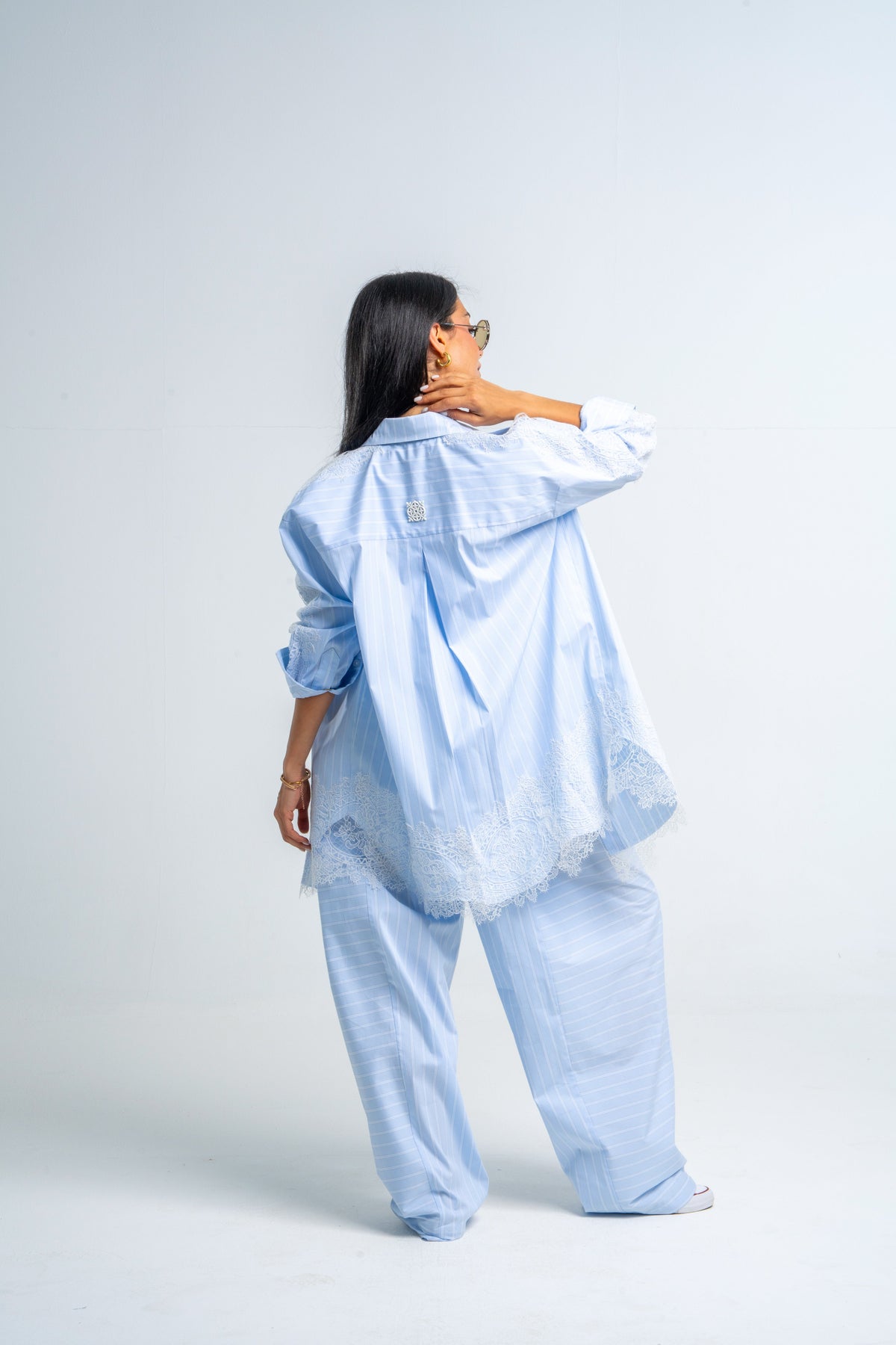 An oversized patchwork lace shirt with a relaxed fit, blending soft stripes and delicate lace for an easy, effortlessly styled look.