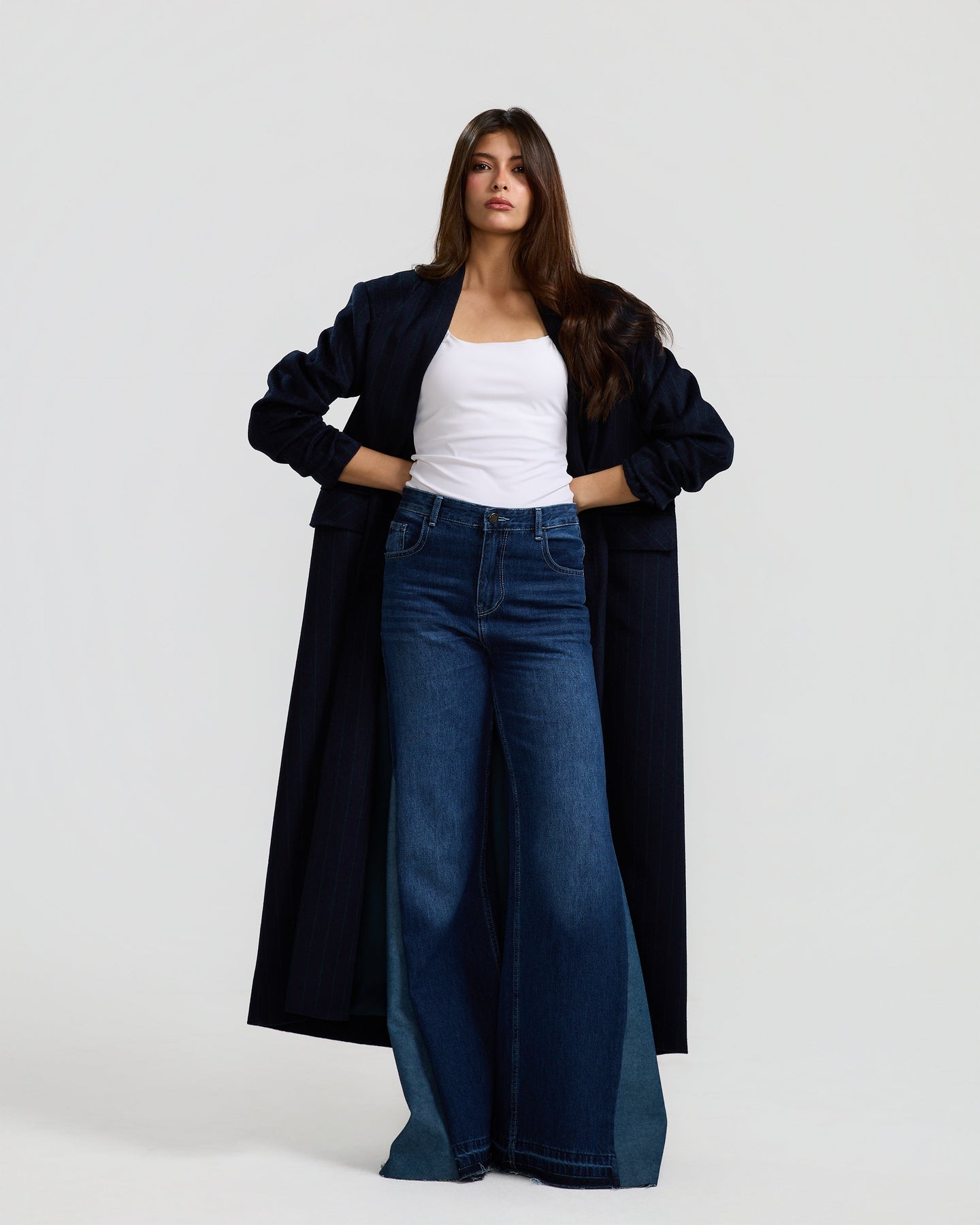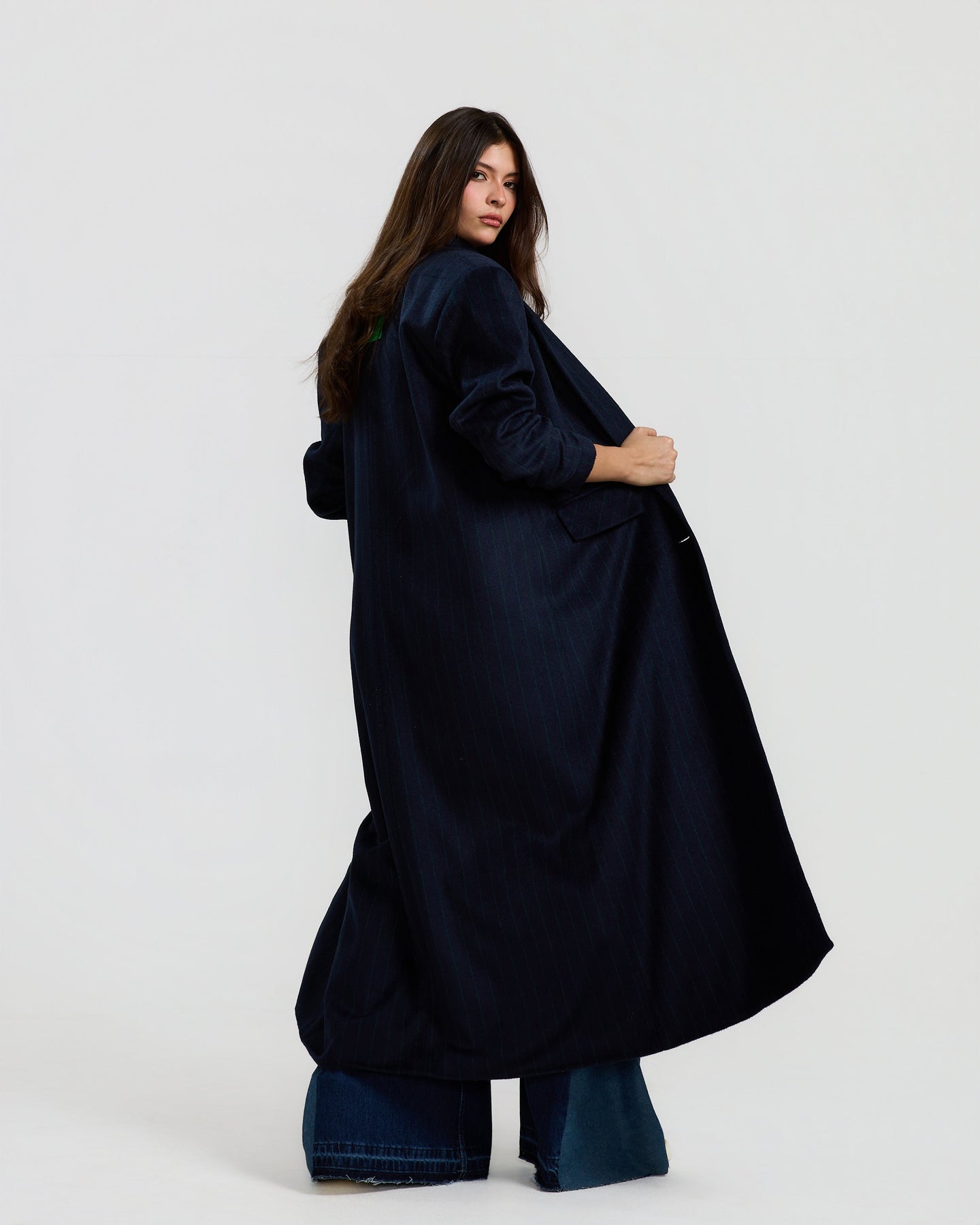 An oversized navy coat with soft, fluid lines and a relaxed silhouette, designed to move effortlessly while keeping a bold, structured feel.
