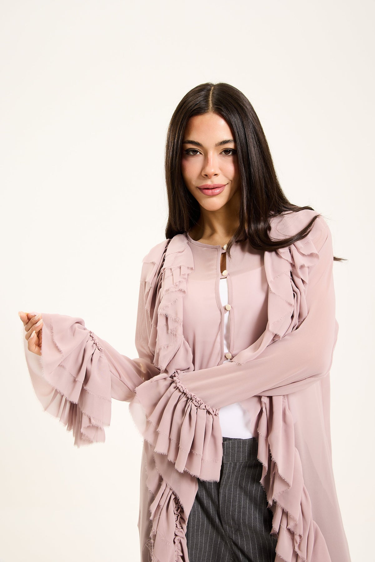 A statement black ruffle maxi chiffon top featuring cascading layered details and a lightweight sheer finish for dramatic, flowy elegance.