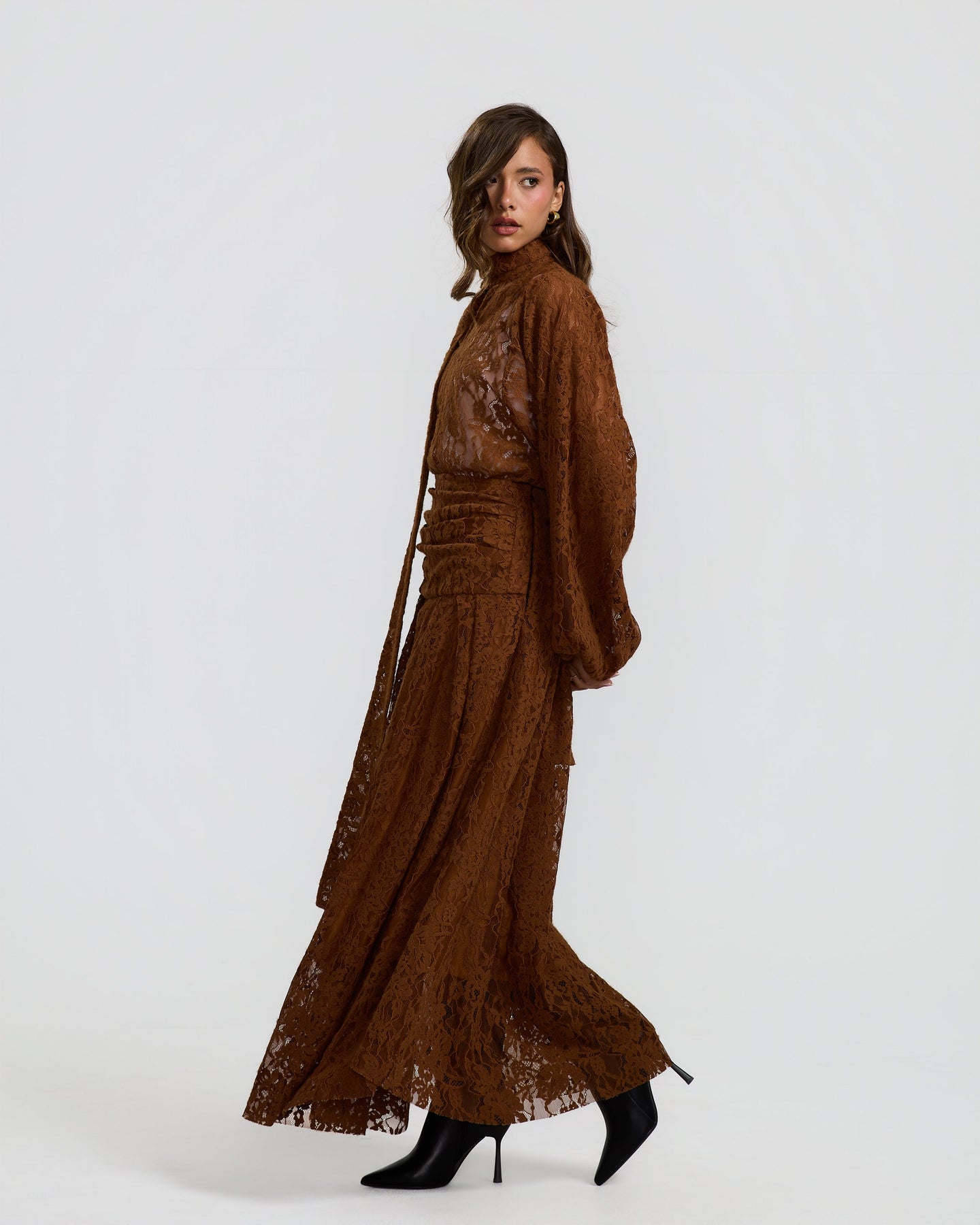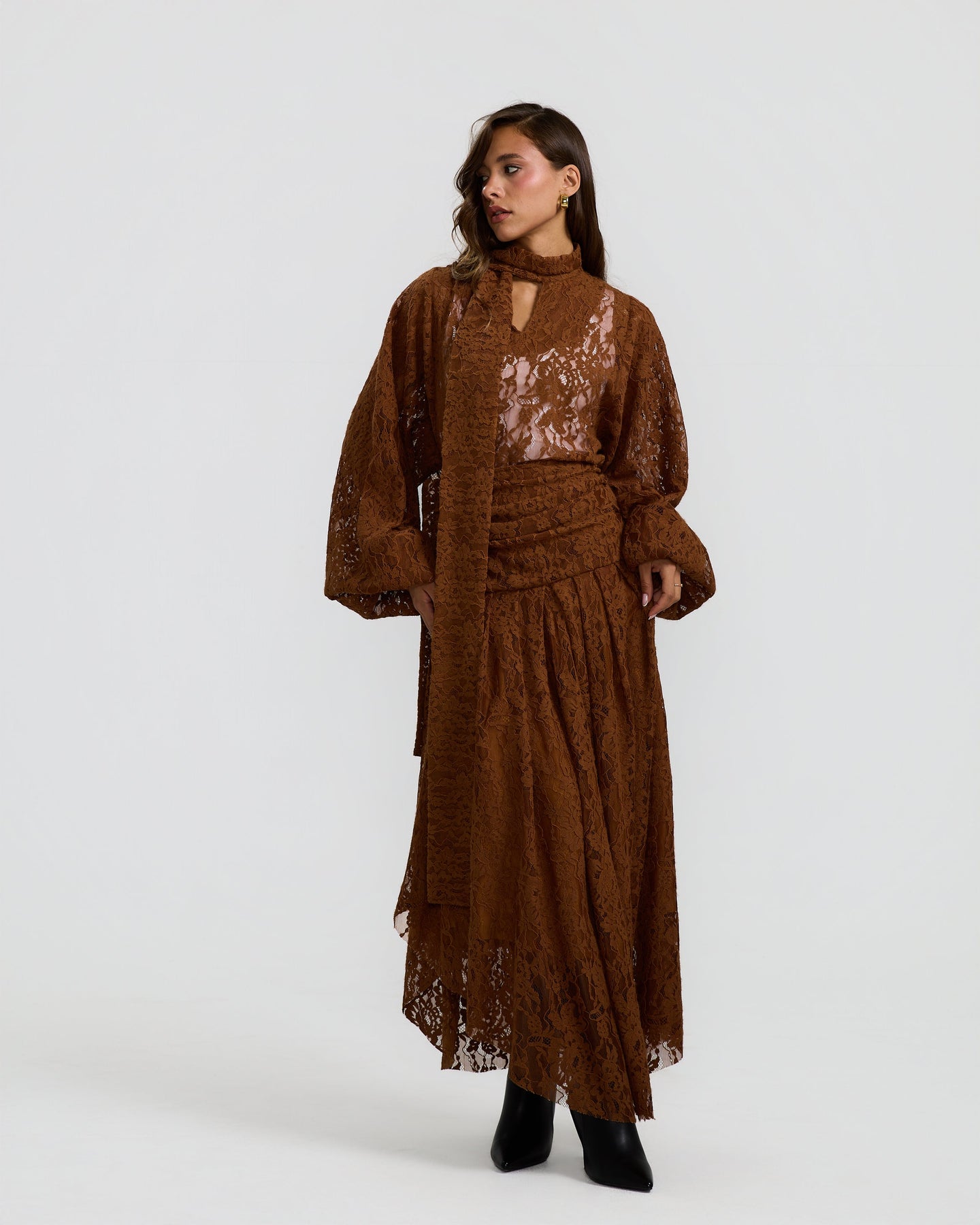 A flowy brown lace skirt with a soft drape and layered texture, designed to move beautifully with every step.