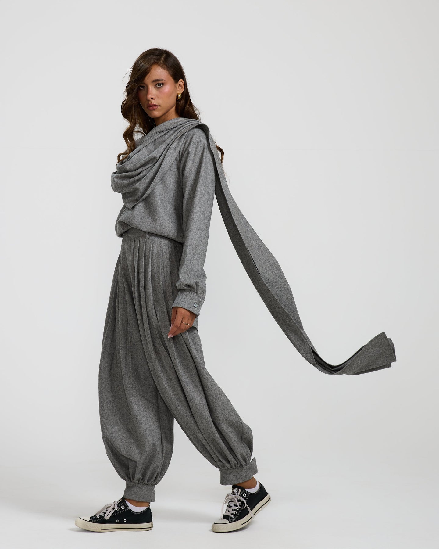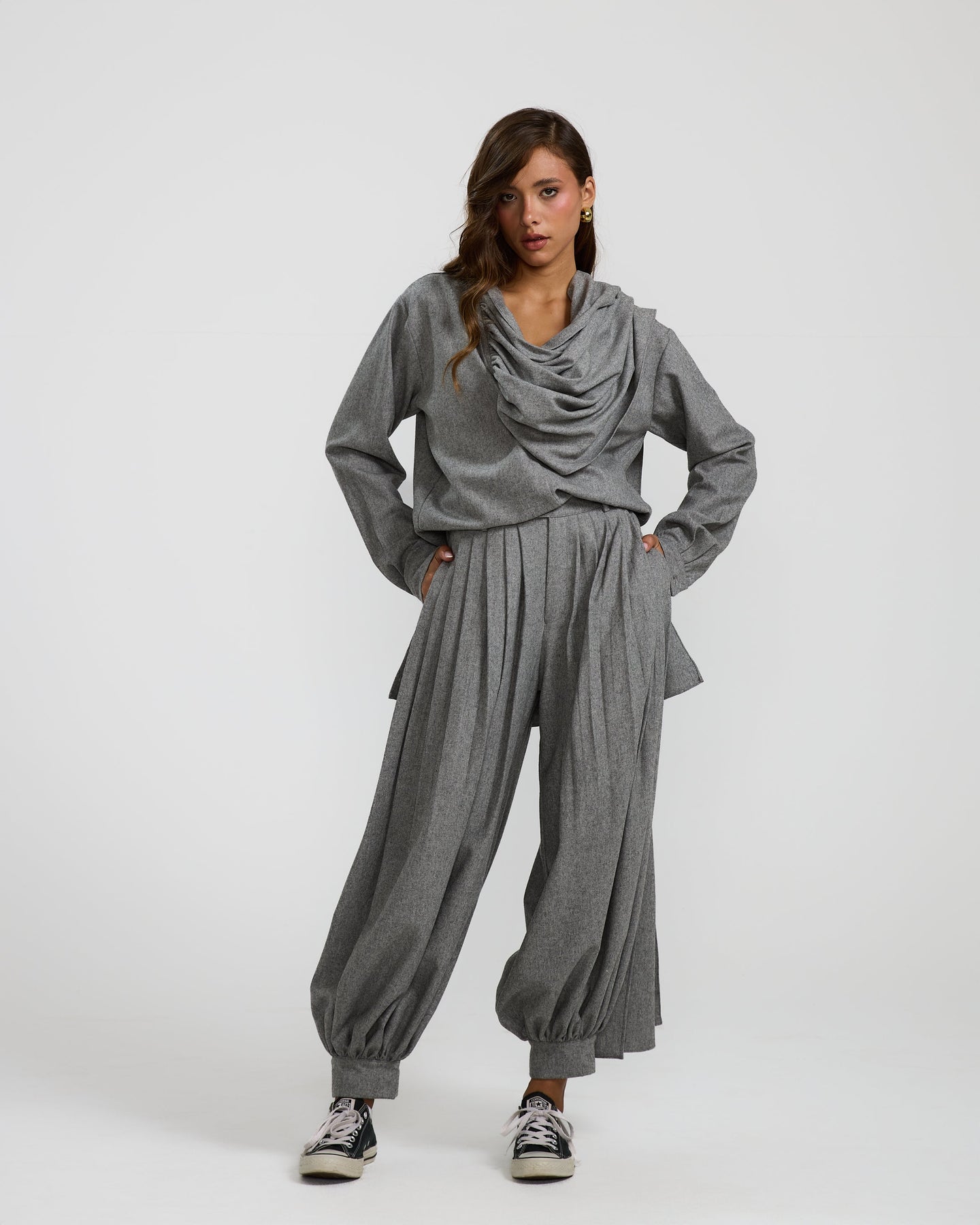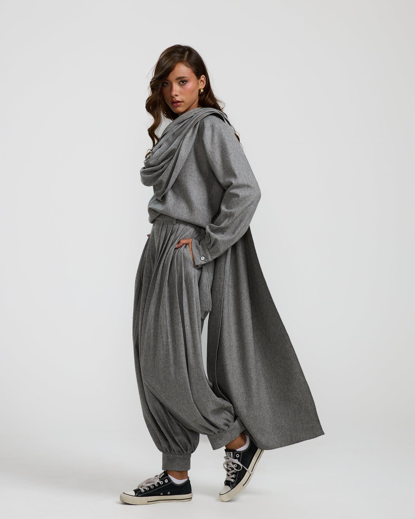 This grey shawl top features a soft, draped neckline and a relaxed fit, making it easy to wear and comfortable while still looking stylish.