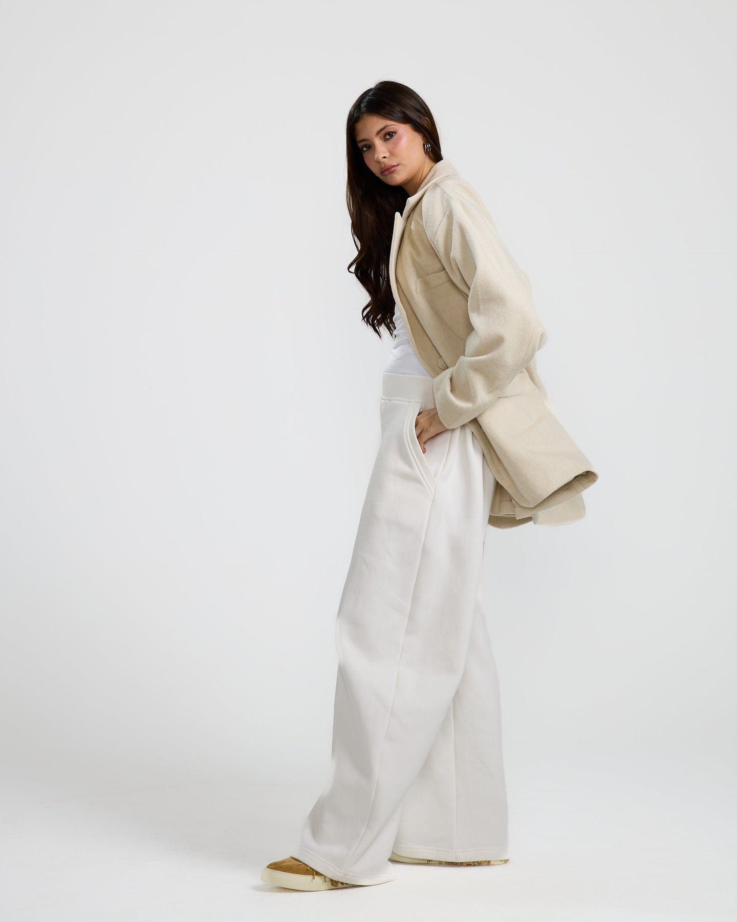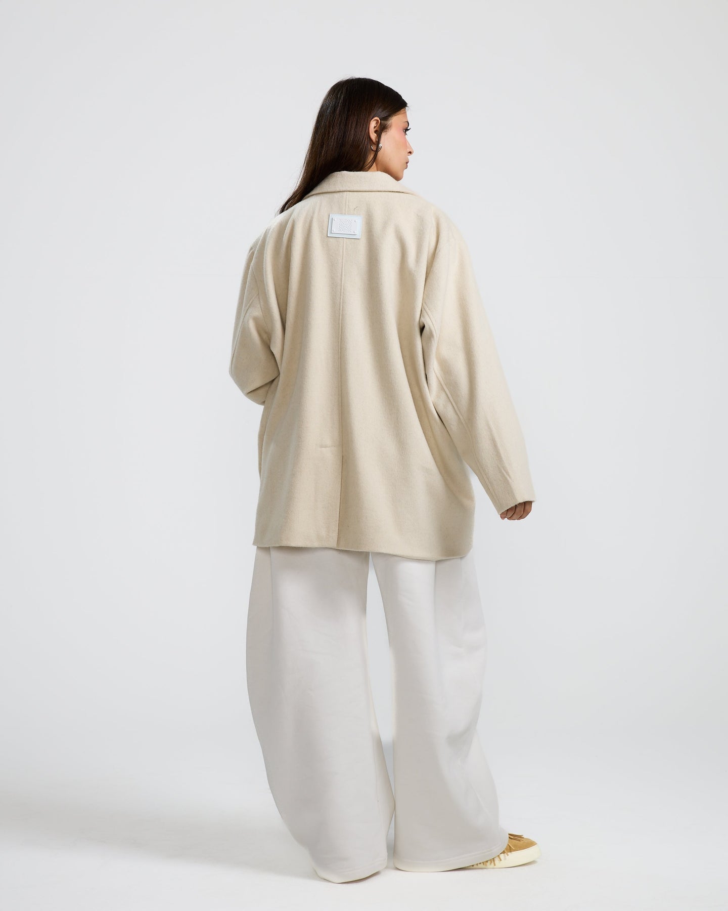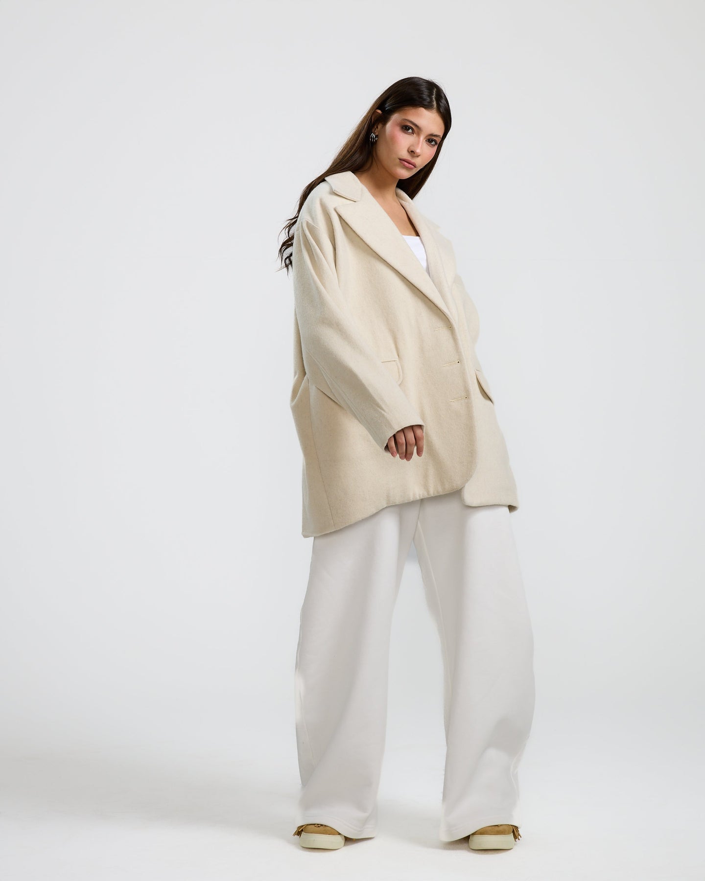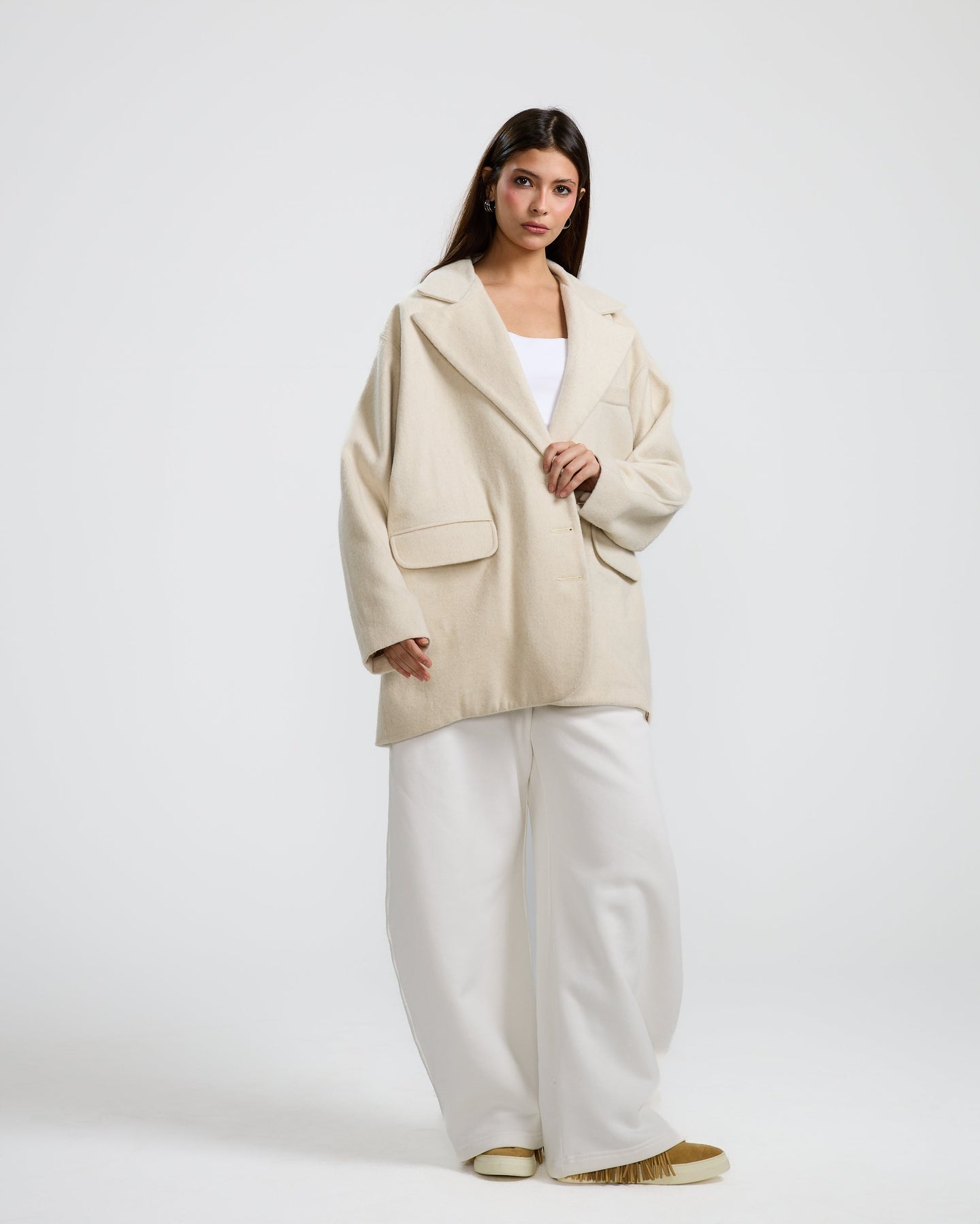 An oversized off-white blazer with a relaxed fit, soft shoulders, and minimal tailoring for an easy, modern look.