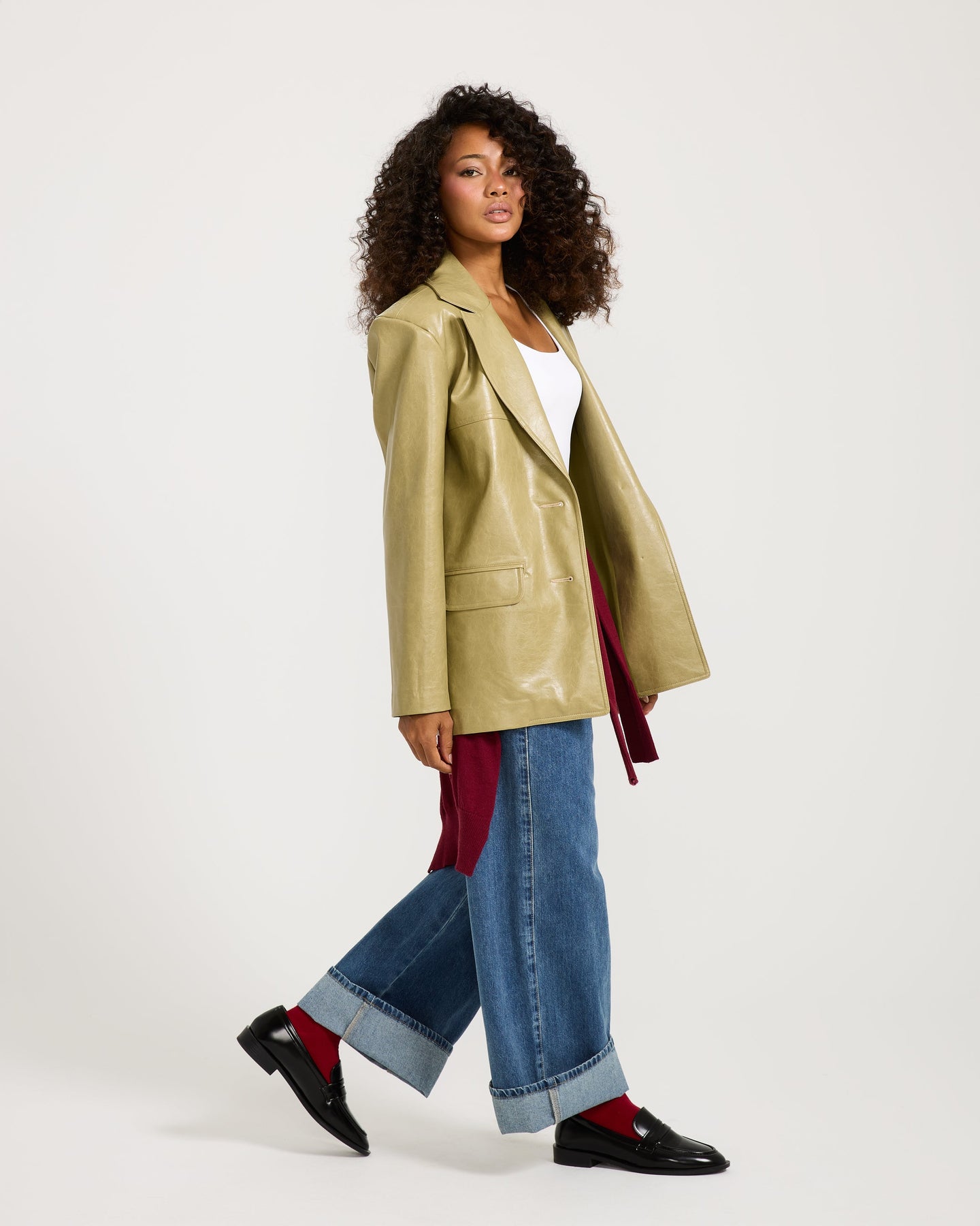 This olive leather blazer boasts a sleek, structured fit with a smooth finish, adding a bold yet polished touch to any outfit.