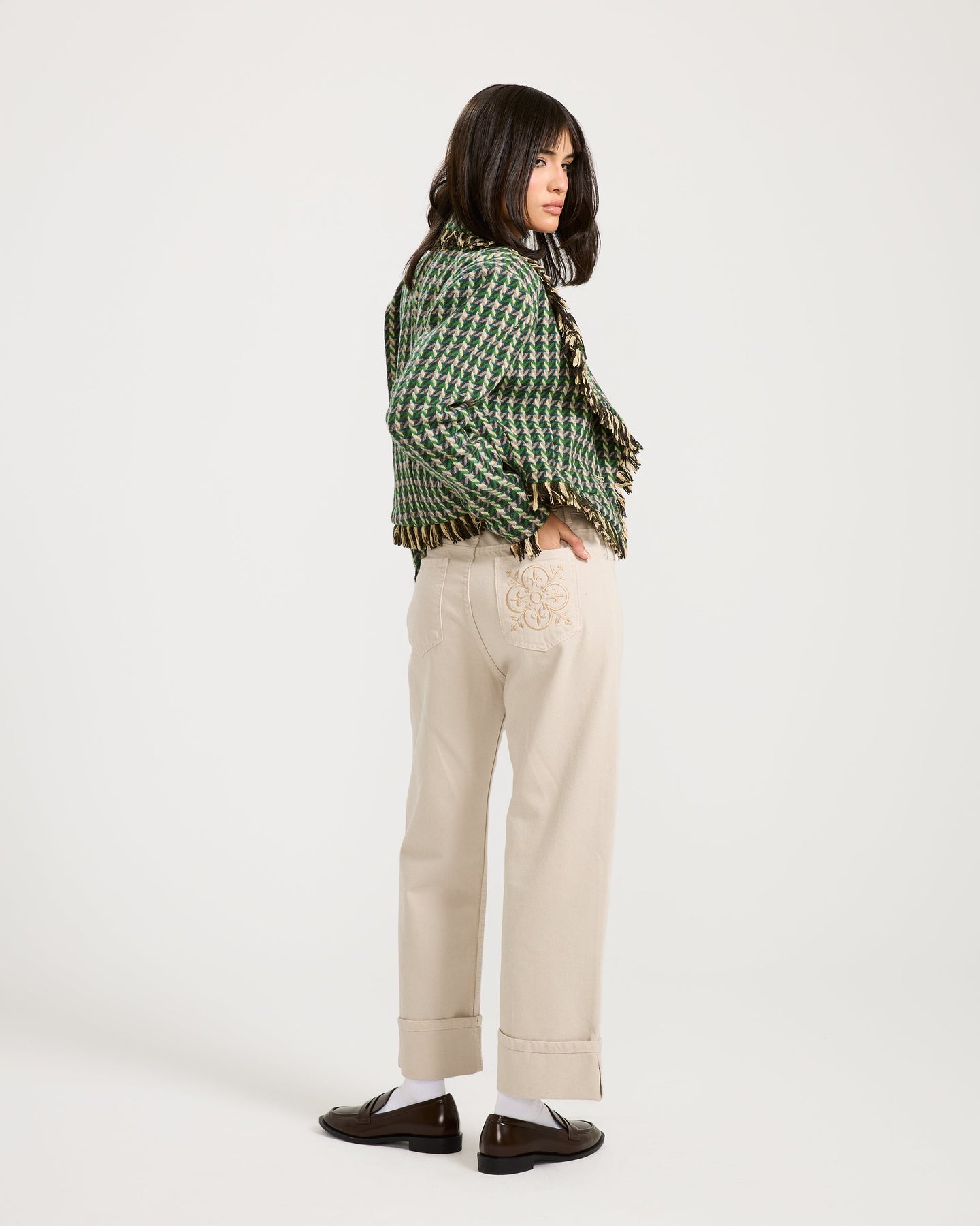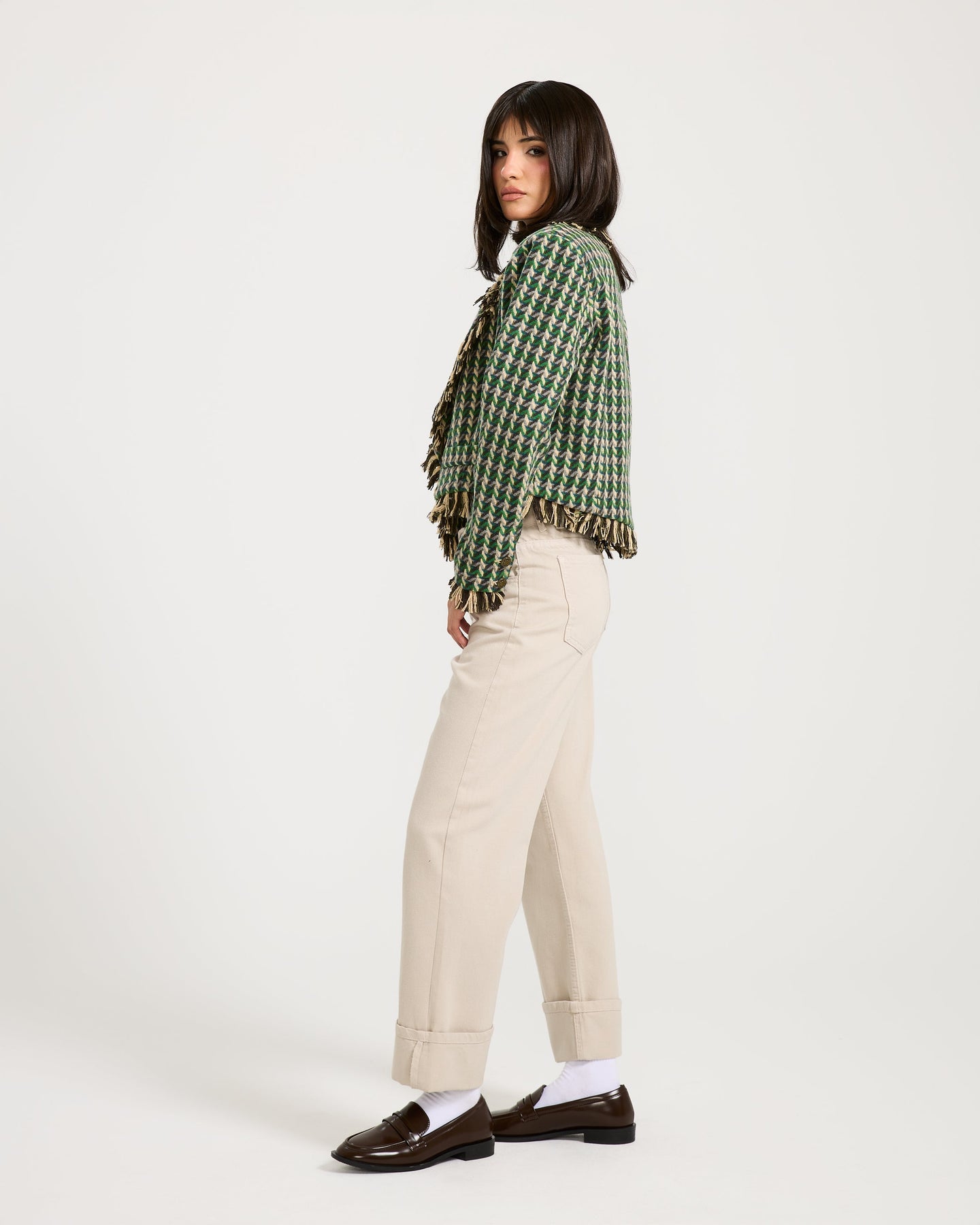 This tweed jacket features a green and beige pattern with fringe detailing all around, giving it a bold and textured finish — a standout piece that adds character to any look.