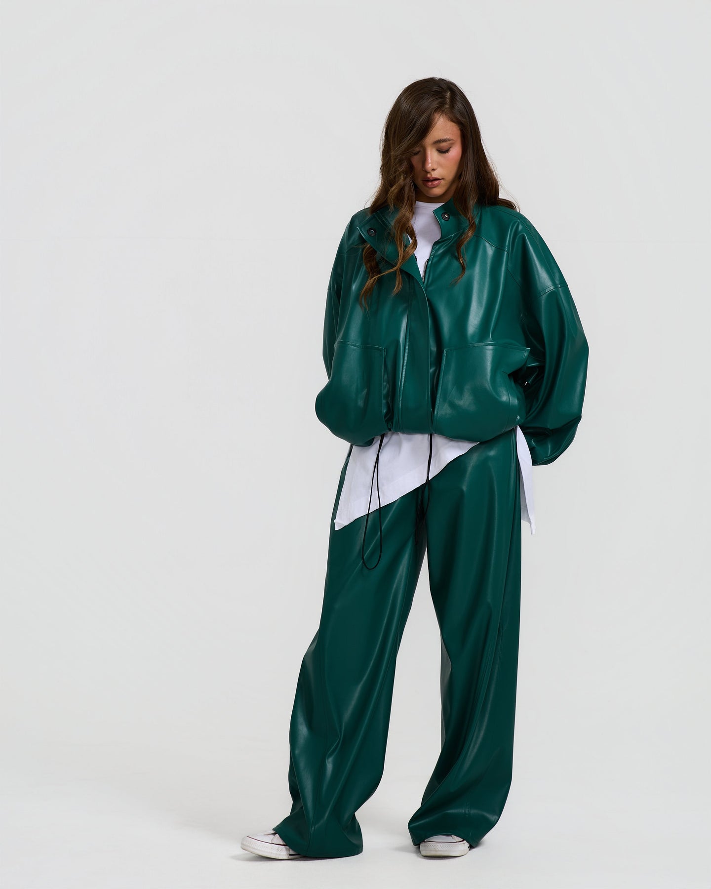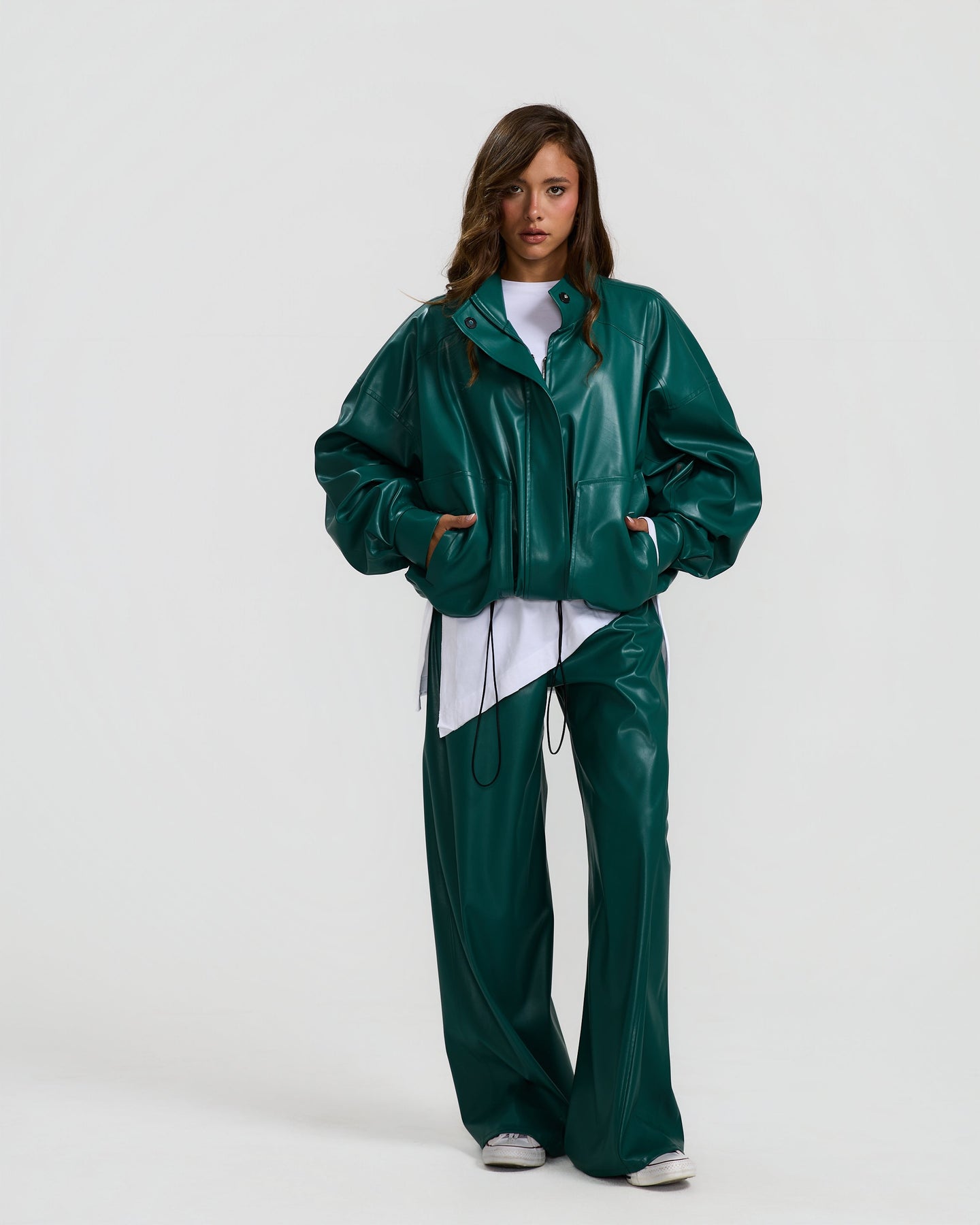 This dark green leather jacket features an oversized fit with a high collar and front pockets — sleek, modern, and effortlessly cool.