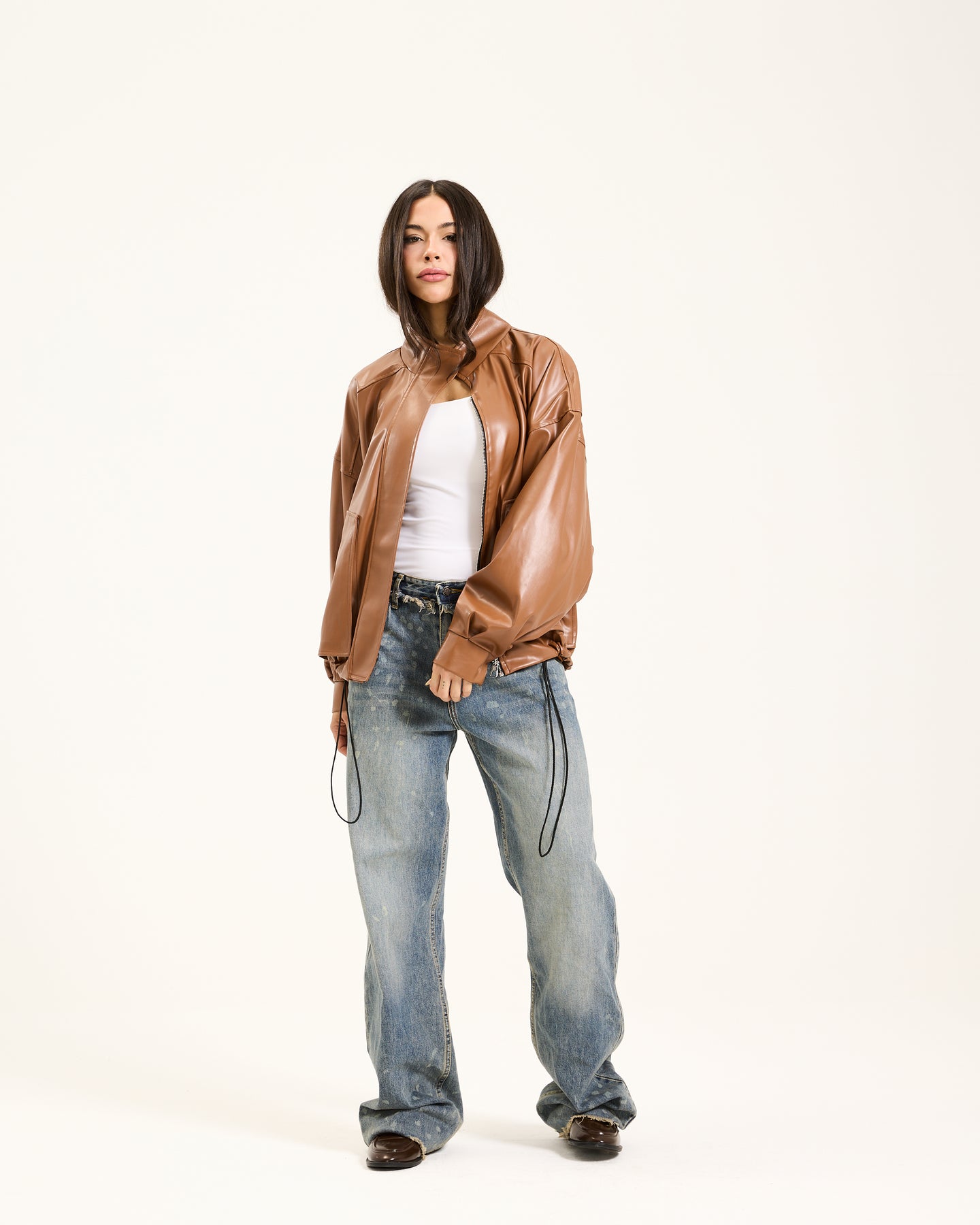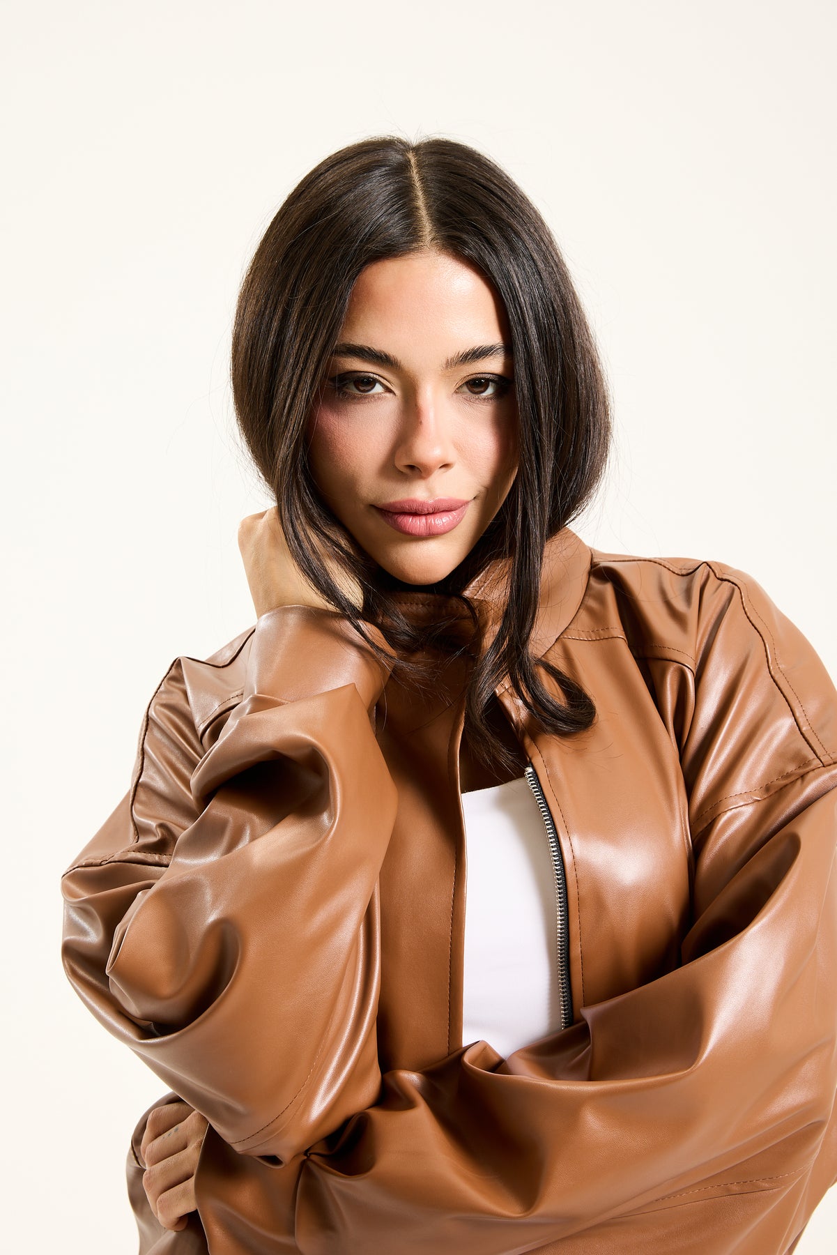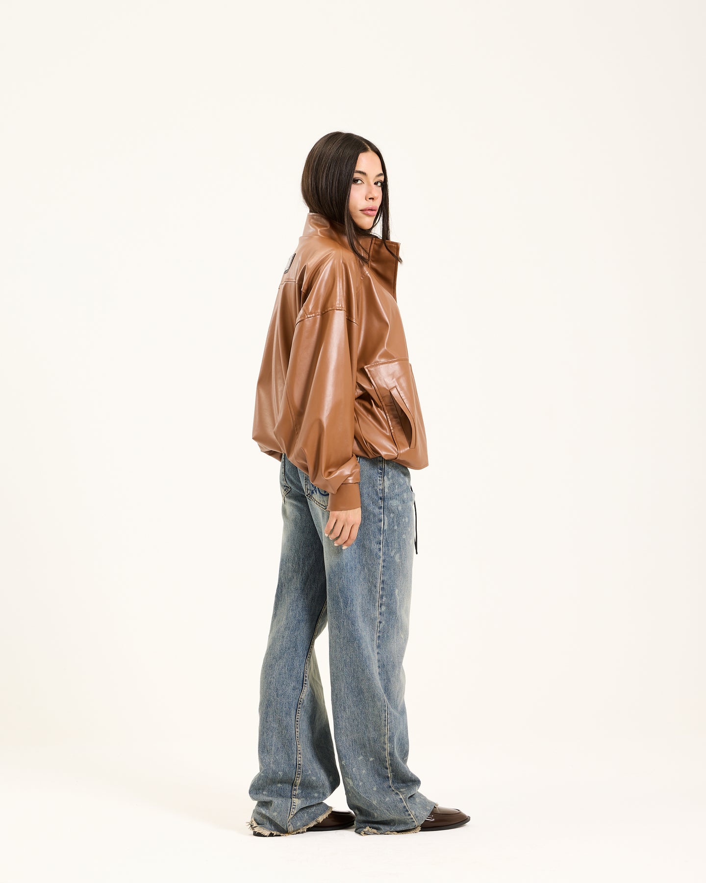 This dark green leather jacket features an oversized fit with a high collar and front pockets — sleek, modern, and effortlessly cool.
