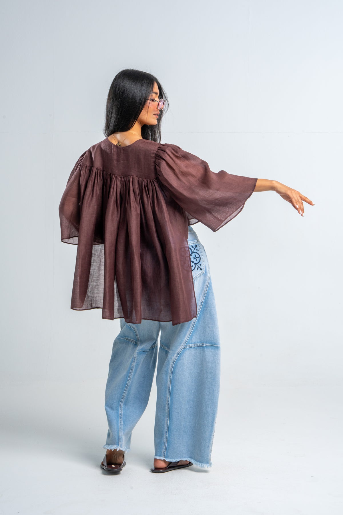 A cropped, flowy transparent linen top with a soft, airy feel, perfect for layering and adding an effortless touch to your look.