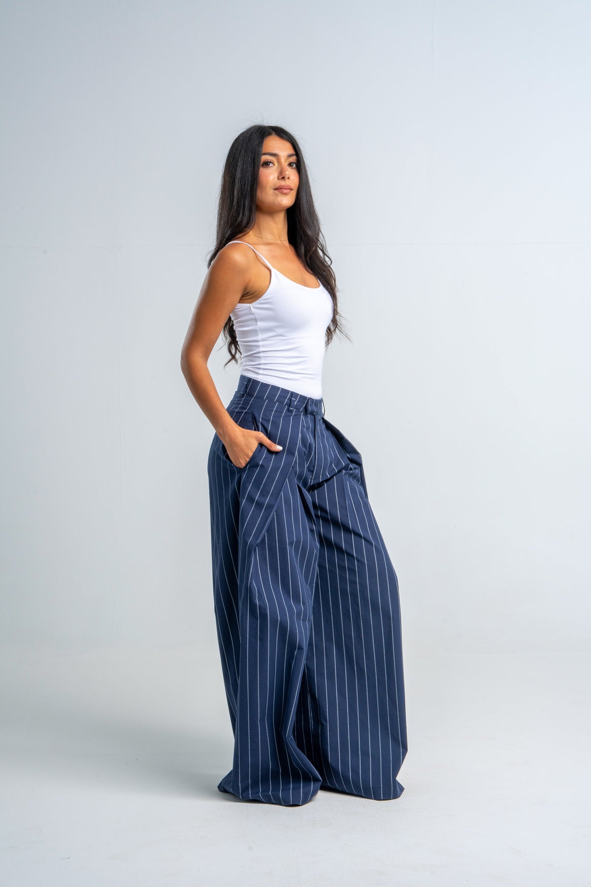 These flapped wide leg pants have a loose fit with stripes and front pleats that add an edge to your step.