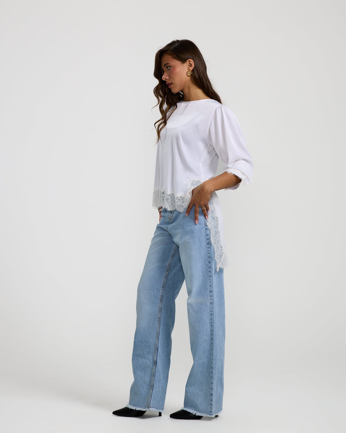 This white satin blouse features a lace-trimmed hem — effortlessly elegant with a modern, feminine edge.