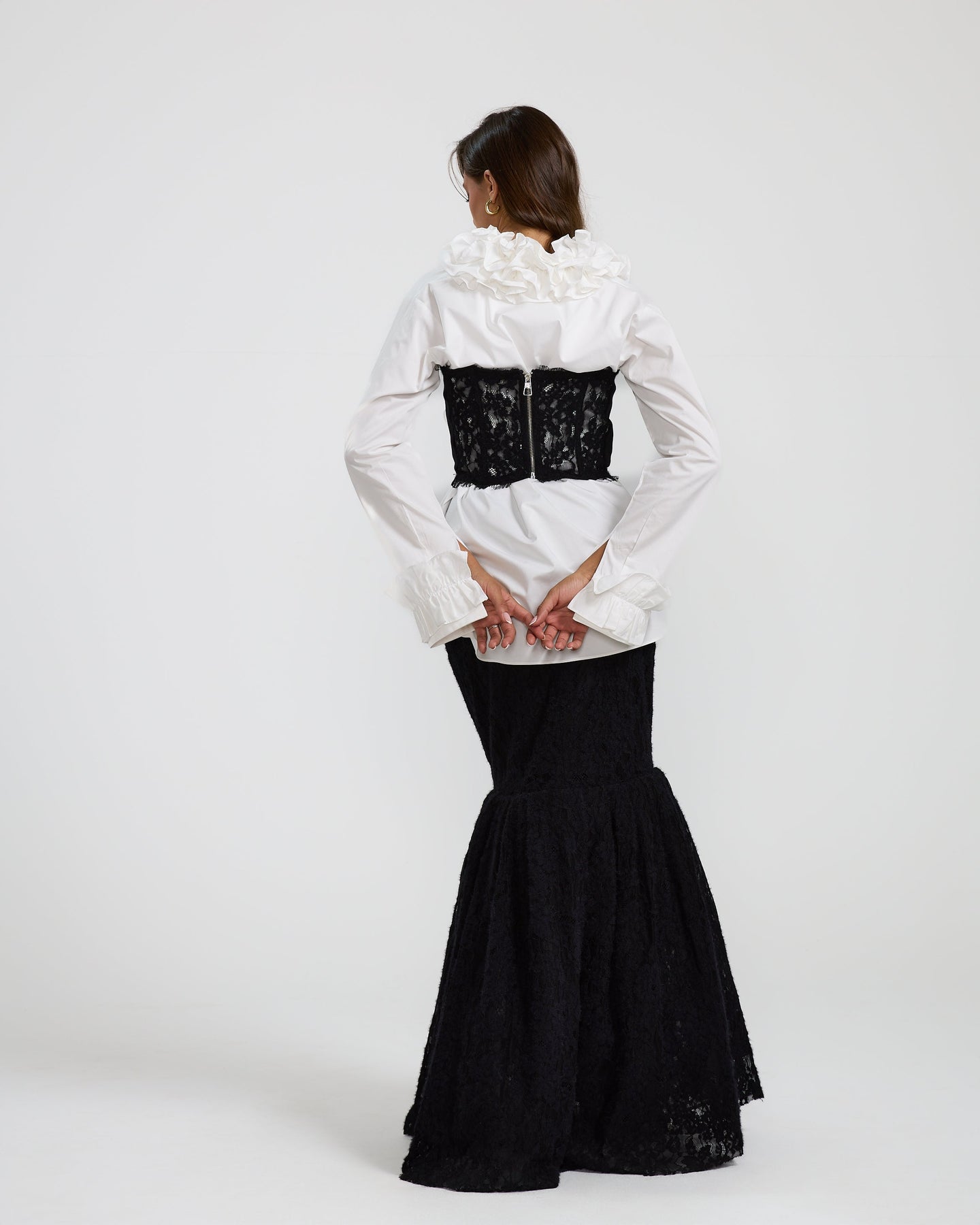 This black lace mermaid skirt features a fitted waist and flared hem — dramatic, feminine, and timelessly elegant.