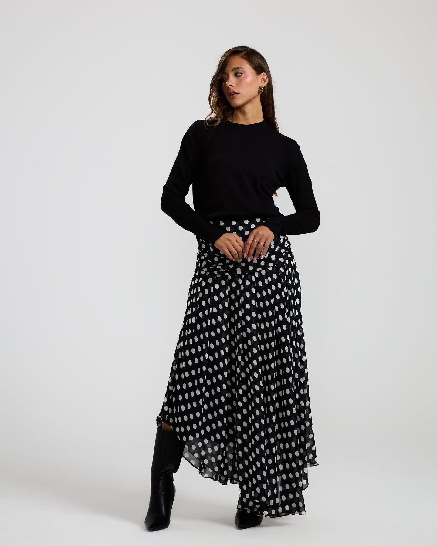 This black-and-white polka dot skirt features a soft, flowing silhouette with an asymmetric hem — playful, elegant, and full of movement.