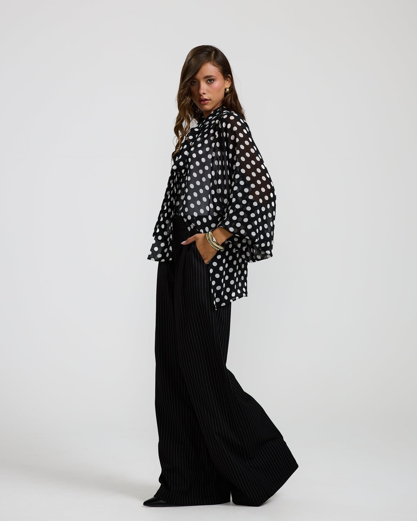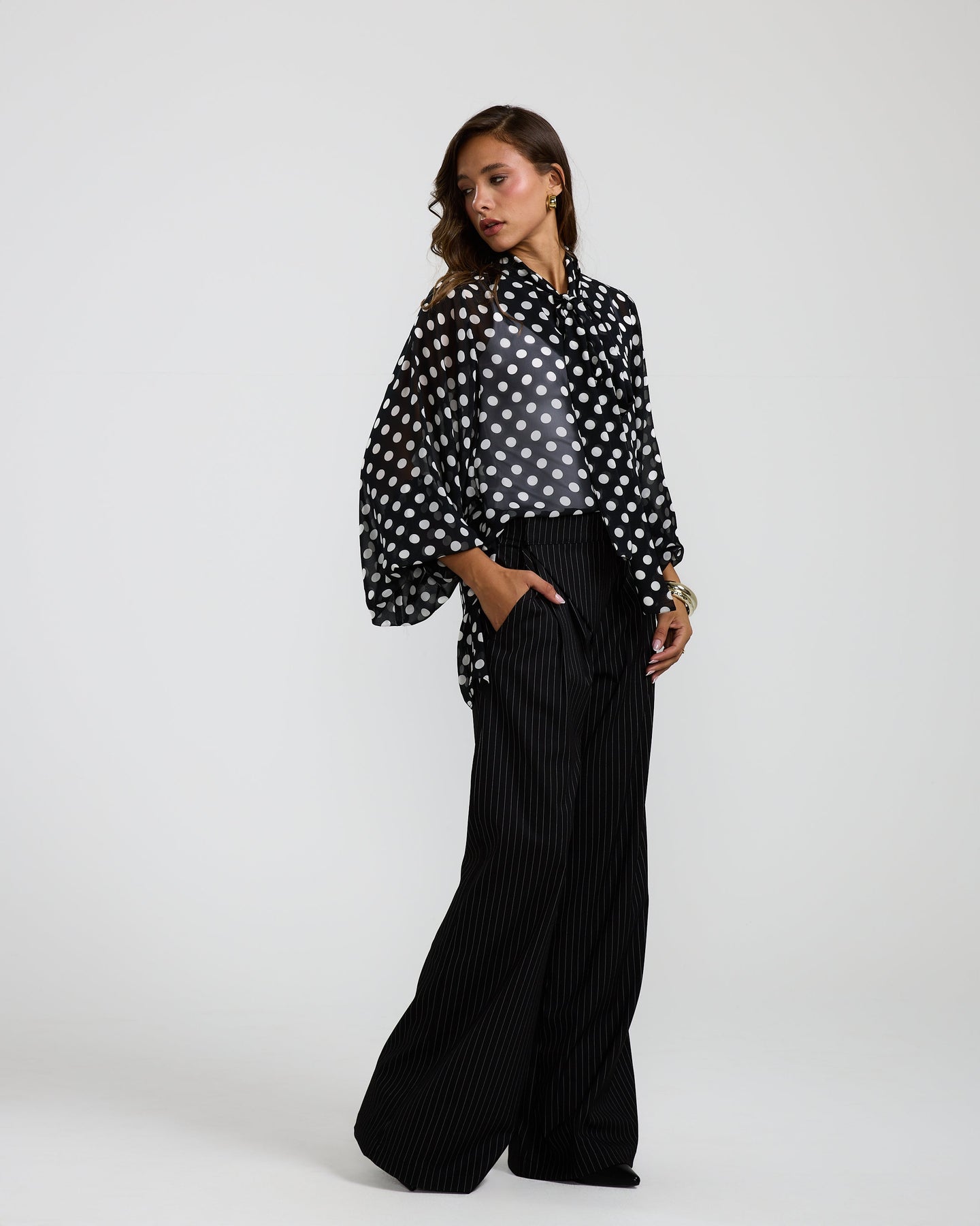 This black and white polka dot blouse features a loose, flowy fit with a tie-neck detail — playful, chic, and easy to dress up or down.