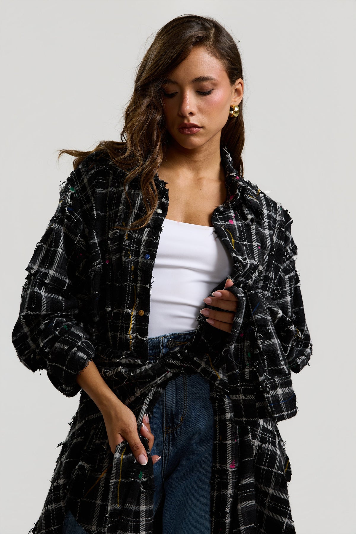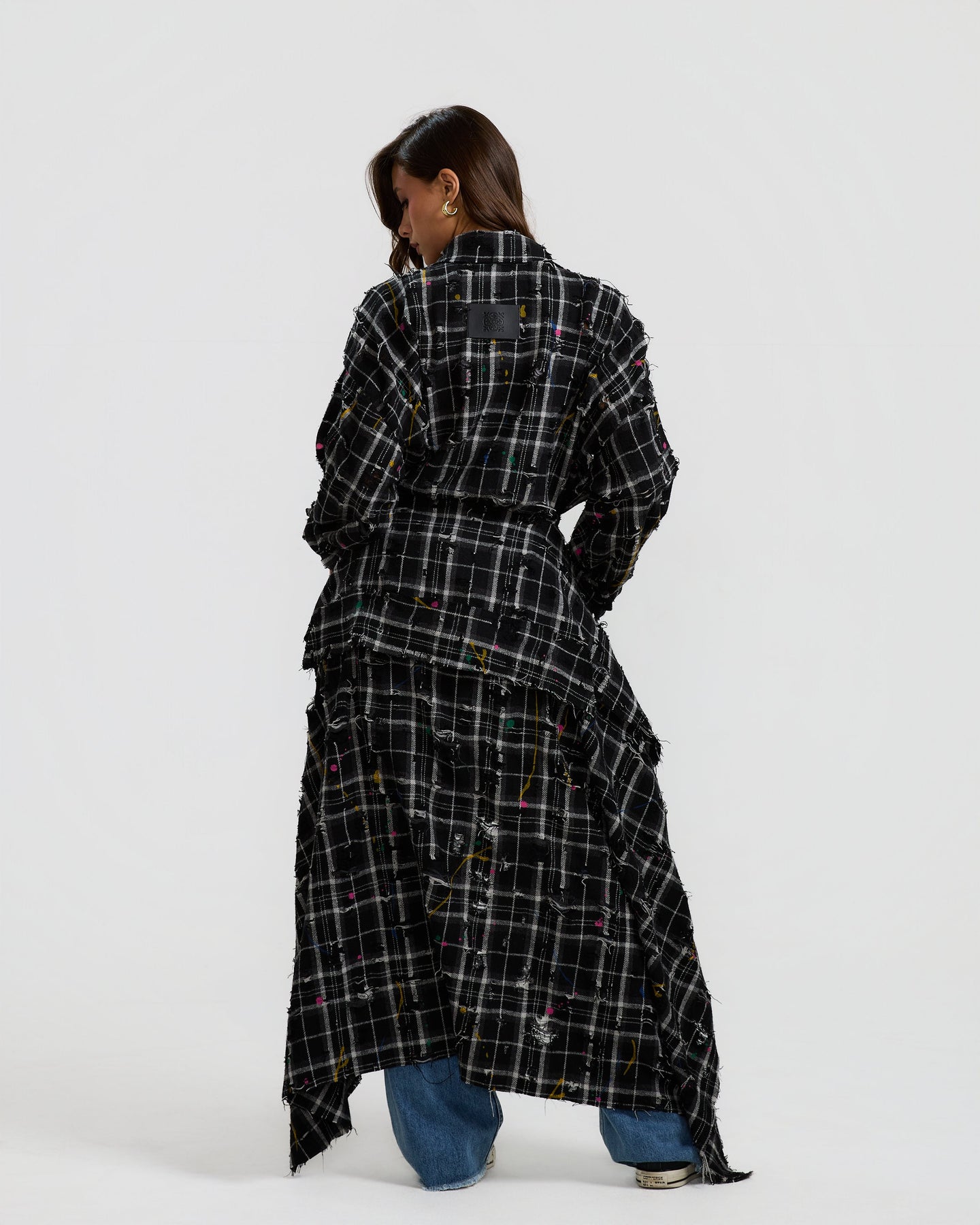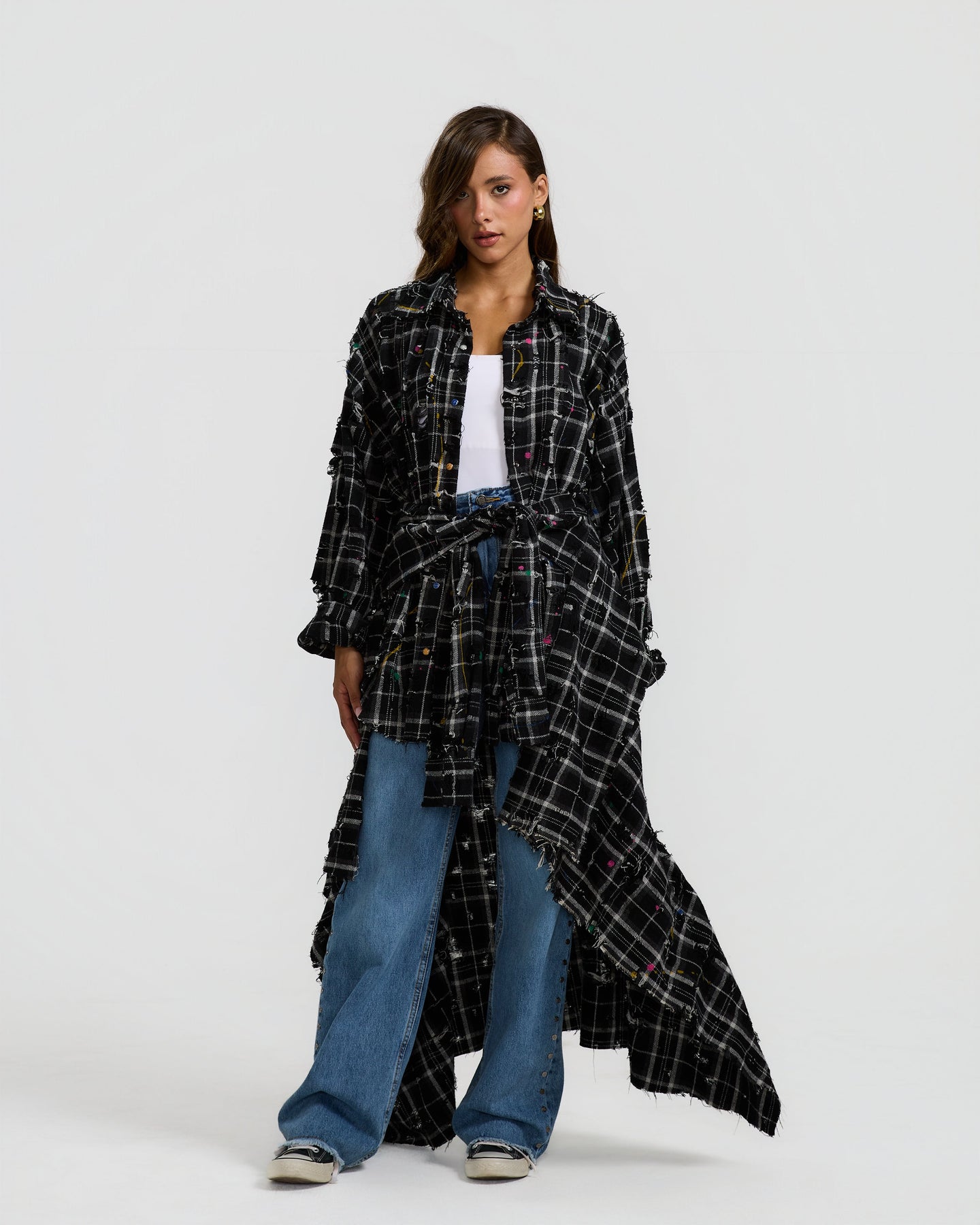 This two-piece checker wraparound shirt features a distressed plaid texture and asymmetric drape, striking the perfect balance between effortless edge and modern structure.